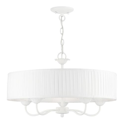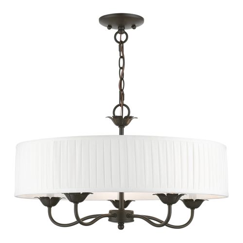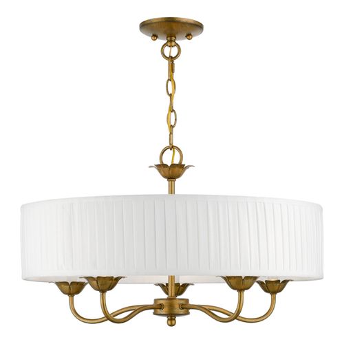 The five-light Edinburgh pendant chandelier combines floral details and casual elements to create an updated look. The hand-crafted off-white fabric hardback pleated drum shade is set off by an inner silky white fabric that combines with chandelier-like sweeping arms which create a versatile effect. Perfect fit for the living room, dining room, kitchen or bedroom. Choose from Antique Brass, Antique Gold Leaf, Black, Brushed Nickel, English Bronze, or White finishes.