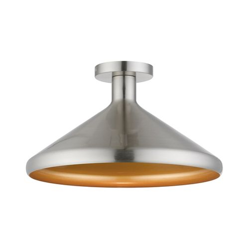Featuring a clean and crisp modern look, the Geneva 1-light flush mount makes a contemporary statement with the smooth cone shape of its Antique Brass or Brushed Nickel exterior. A gleaming finish on the interior of the metal shade brings a refined touch of style.