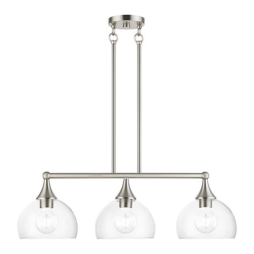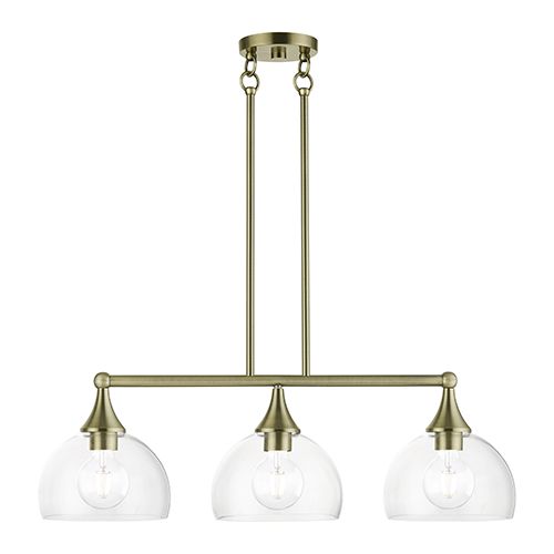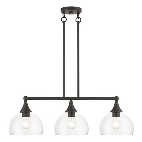 The Livex Lighting Glendon Linear Chandelier embodies understated elegance with its minimalist design, clear curved glass shades, and versatile compatibility with various decor styles. Available in Antique Brass, Black, Bronze, and Brushed Nickel finishes, this chandelier features a 30-inch steel bar suspended from the ceiling by two adjustable bars, allowing for customized height placement. Its hand-blown clear glass shades have dimensions of 8 1/4" in diameter and 5 3/4" in height, accommodating three medium base bulbs with a maximum wattage of 60 each. Illuminate your space with this sophisticated and adaptable linear chandelier, bringing both style and functionality to your home.
