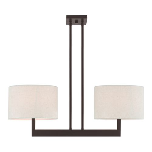 Raise the style bar with a designer linear chandelier in a handsome and versatile contemporary manner. This two light linear chandelier comes in a bronze finish with round oatmeal fabric hardback shade.