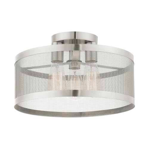 The Industro collection has a clean, crisp look and contemporary appeal. This three-light medium semi-flush has a sleek stainless steel mesh shade. Will adapt well in the hallway, bathroom, kitchen and bedroom tastefully elevating your style. Choose from Black or Brushed Nickel finishes.