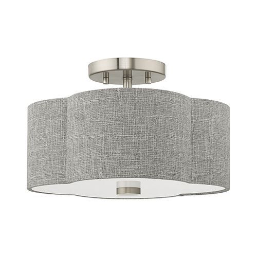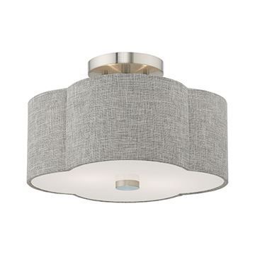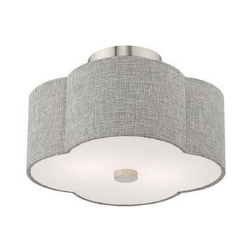 The Brushed Nickel frame gives the Livex Lighting Kalmar Ceiling Mount Light a modern feel while the clover-shaped gray handcrafted hardback drum shade adds an elegant touch.
