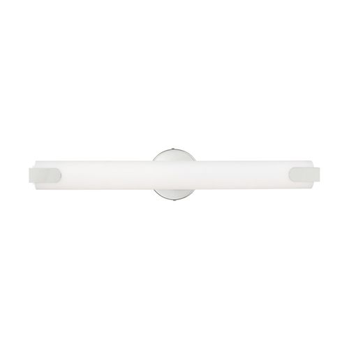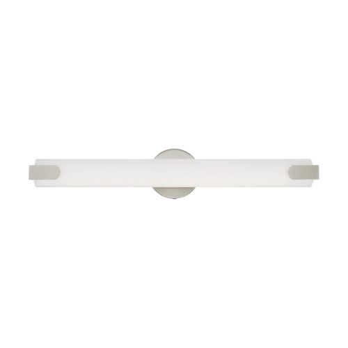 A simple satin white acrylic shade creates the bold appearance of this contemporary bath light. The frame encloses this energy-efficient design that glows with uniform light from an integrated LED module. Can be installed vertically or horizontally. Choose from Brushed Nickel or Polished Chrome finishes.
