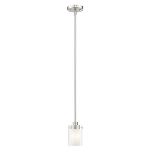 This Brushed Nickel finish brings sleek sophistication to this contemporary mini pendant. The clean lines are enhanced by the hand blown clear glass cylinders with opal centers. The double layer of glass adds a level of depth and visual interest to this transitional style light fixture.