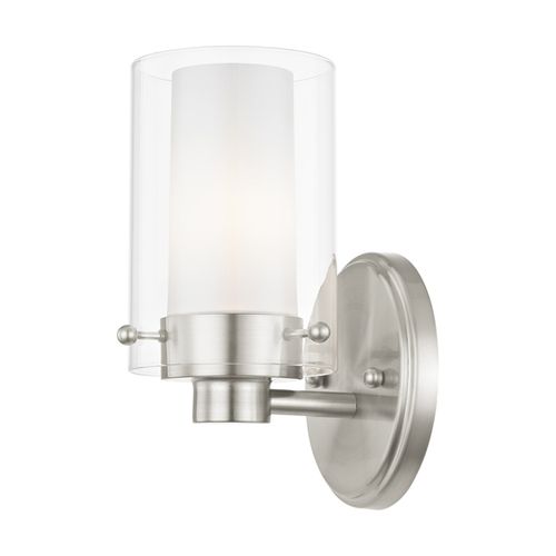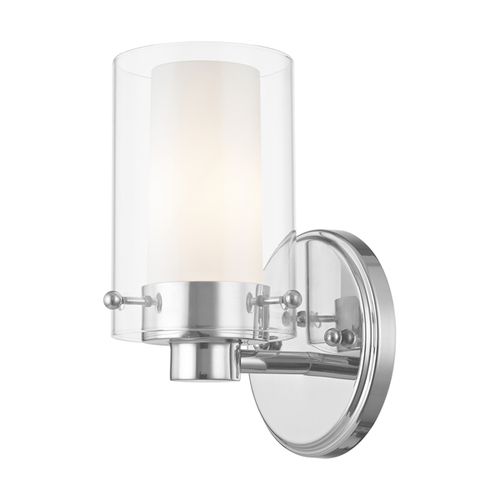 This transitional one light bathroom fixture will bring posh sophistication to your decor. The backplate and simple metal arms give this fixture a sleek, contemporary look. Opal etched glass surrounds each light, encased in clear glass cylinders for a stunning double-glass effect. Choose from Brushed Nickel or Polished Chrome finishes.