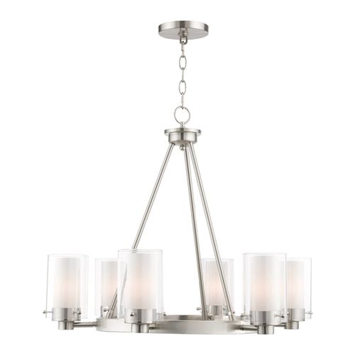 The Brushed Nickel finish brings sleek sophistication to this contemporary chandelier. The clean lines are enhanced by the hand blown clear glass cylinders with opal centers. The double layer of glass adds a level of depth and visual interest to this transitional style light fixture.