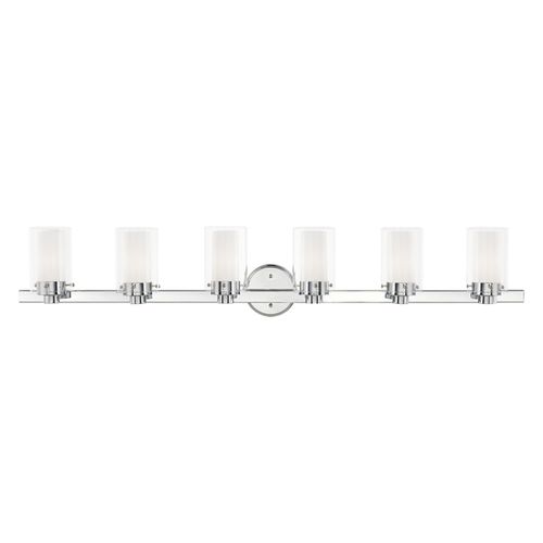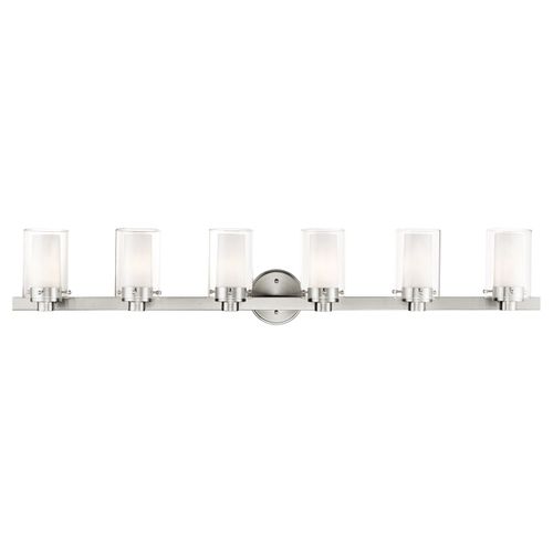 This transitional six-light extra large Manhattan collection vanity sconce will bring posh sophistication to your decor. The backplate and simple metal arms give this fixture a sleek, contemporary look. Opal etched glass surrounds each light, encased in clear glass cylinders for a stunning double-glass effect. Choose from Black Chrome, Brushed Nickel, or Polished Chrome finishes.
