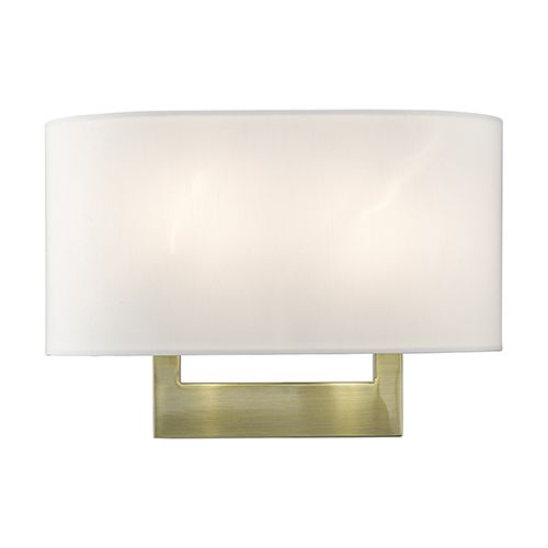 Elevate your decor with the Livex Lighting Medium ADA 2 Light Wall Sconce featuring a rectangular off-white fabric hardback shade. Available in Antique Brass, Black, Bronze, or Satin Brass finish. The hand-crafted off-white color hardback fabric shade with white fabric inside measures 13" in width, 6 1/2" in height, and extends 3 15/16" from the wall. It accommodates two medium base bulbs with a maximum wattage of 40 each and is mounted on a 10" width, 6" height, and 7/8" depth backplate, offering both style and functionality to your space. Illuminate your surroundings with this chic wall sconce that seamlessly combines form and function.