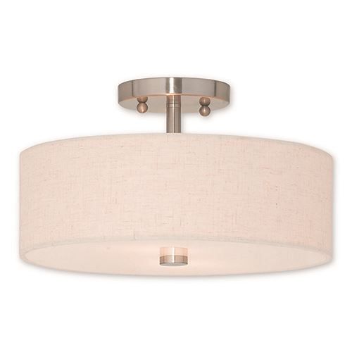 Livex Lighting Meridian 13 Inch Ceiling Mount Light features a beautiful hand crafted oatmeal fabric hardback drum shade in a stylish Brushed Nickel or English Bronze.