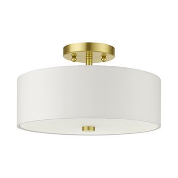 The Livex Lighting Meridian 13 Inch Satin Brass Semi Flush Light showcases off-white, fabric hardback shades and hardware in Satin Brass finish. This medium two-light drum shade adds character to this handsomely styled semi flush mount. Will adapt well in the kitchen, hallway or bedroom tastefully elevating your style.