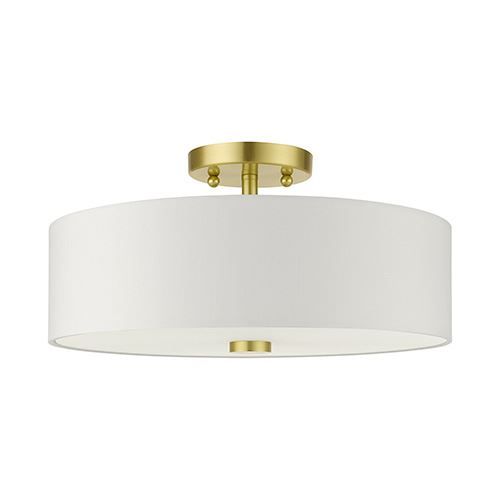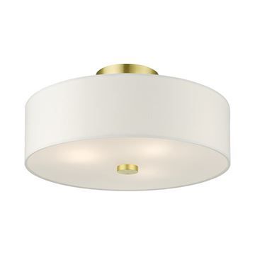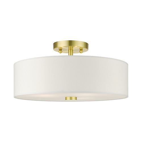 The hand-crafted off-white fabric hardback shade offers a diffused warm light in this stylish Livex Lighting Meridian 15 Inch Semi Flush Light. This large three-light drum shade adds character to this handsomely styled semi flush mount. Perfect for living room, kitchen, dining room and bedroom tastefully elevating your style. This sleek design is available in a Satin Brass finish.