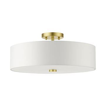 The Meridian collection has a clean, crisp look and contemporary appeal. The hand-crafted off-white fabric hardback shade offers a diffused warm light. This large four-light drum shade adds character to this handsomely styled semi flush mount. Will adapt well in the living room, dining room and bedroom tastefully elevating your style. This sleek design is available in a Satin Brass finish.