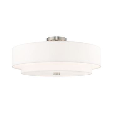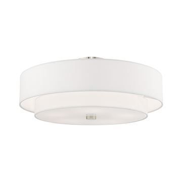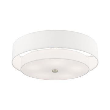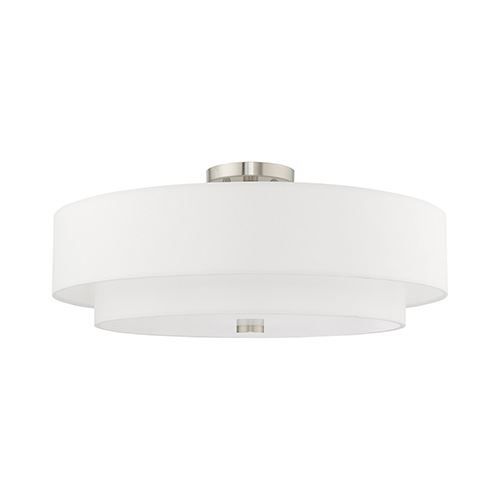 Livex Lighting Meridian Double Shade Off White Ceiling Light features a lovely hand crafted off-white fabric hardback shade and frosted diffuser for subtle illumination. Brushed Nickel finish.