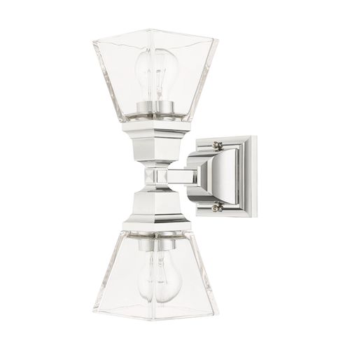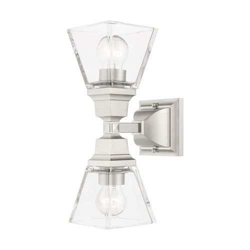 The Mission collection has clean lines with geometric forms. This two light wall sconce features clear glass and square style arms that elevates the classic look. Choose from Brushed Nickel or Polished Chrome finishes.