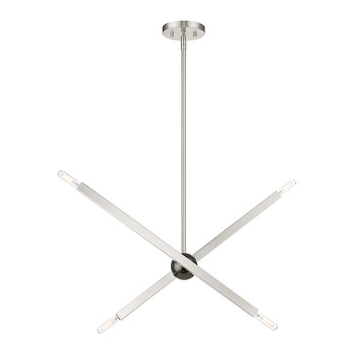 Livex Lighting Monaco Linear Chandelier combines exposed bulbs that softly glimmer at the end of each rectangular arm, introducing a touch of understated glamour to modern spaces. Its timeless criss-cross design imparts an air of openness and motion to any room. This four-light chandelier is a stylish addition to living rooms, modern dining areas, kitchens, or bedrooms. It accommodates four candelabra base bulbs with a maximum wattage of 60 each, making it a functional and elegant choice for enhancing the ambiance of your space.