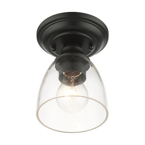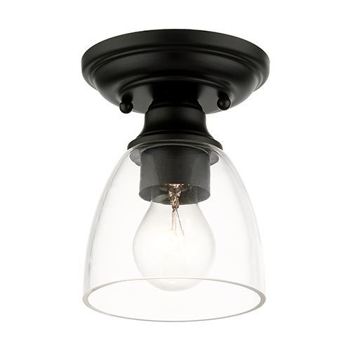 Whether it's style or practical lighting, this flush mount is the perfect addition to your bathroom or hallway. This single-light fixture from the Montgomery Collection features a clear hand-blown glass shade. The clean graceful lines of the canopy complement the shade, creating an understated look that works well in most decors. Classic elegance combines with contemporary appeal to enhance any home in style. Choose from Black or Brushed Nickel finishes.