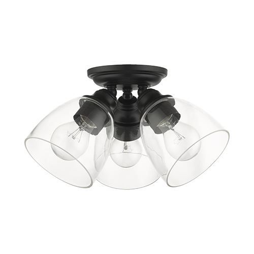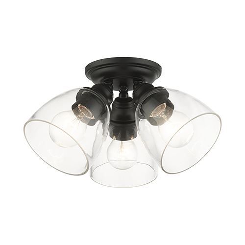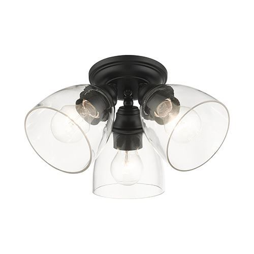 This three-light Livex Lighting Montgomery Large Flush Mount Light features clear hand-blown glass shades in classic Black finished sockets. The clean graceful lines of the canopy complement the shades, creating an understated look that works well in most decors. Classic elegance combines with contemporary appeal to enhance any home in style. Whether it's style or practical lighting, this flush mount is the perfect addition to your bathroom, kitchen, hallway or bedroom.