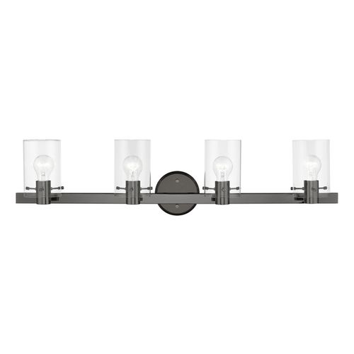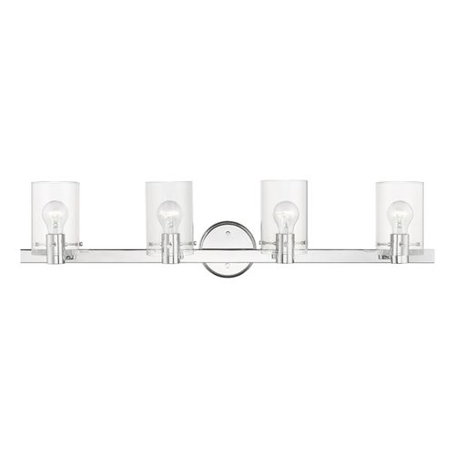 The Munich transitional four light vanity sconce will bring posh sophistication to your decor. The backplate and clear cylinder glass give this fixture a sleek, contemporary look. Choose from Black Chrome, Brushed Nickel, or Polished Chrome finishes.