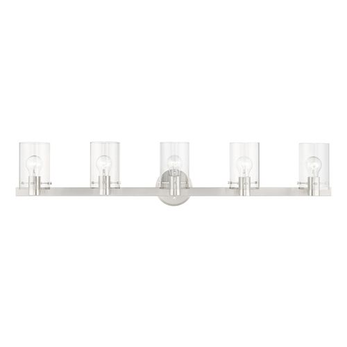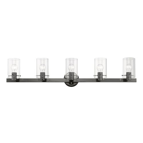 The Munich transitional five light vanity sconce will bring posh sophistication to your decor. The backplate and clear cylinder glass give this fixture a sleek, contemporary look. Choose from Black Chrome, Brushed Nickel, or Polished Chrome finishes.