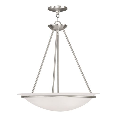 This three light pendant features a lustrous finish with light glowing from within the large white alabaster glass bowl shape shade. complete a kitchen or dining room with this beautiful pendant. Choose from Antique Brass, Black, Bronze, or Brushed Nickel finishes.