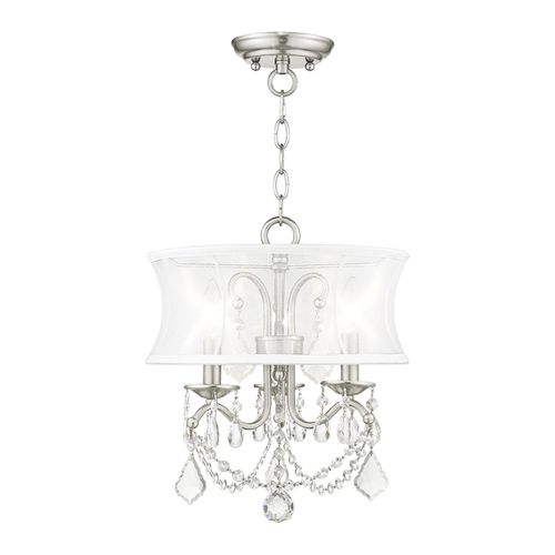 Add glamour to your home with this enchanting shaded chandelier. Scrolling arms are paired with glittering crystal drops that reflect light when illuminated. A white handmade silk shimmer shade completes this chic design. Choose from Brushed Nickel or White finishes.
