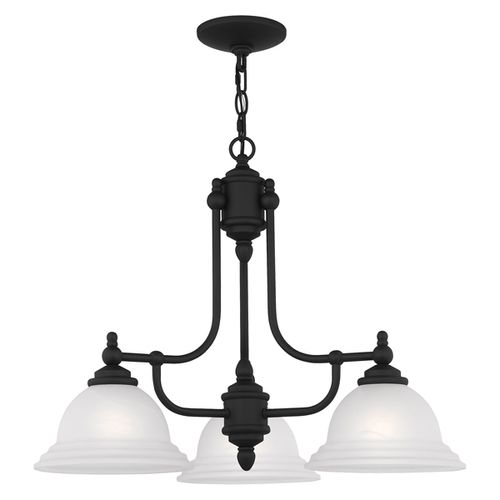 This chandelier brings a clean transitional luminance to your decor. The Black finish contrasts with white alabaster glass resulting in a distinctive lighting accent.