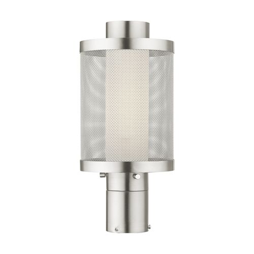 The Nottingham outdoor collection has a clean, crisp look and contemporary appeal. This single light stainless steel medium post top lantern has a clean finish and features a sleek stainless steel mesh shade with satin opal white glass. Choose from Brushed Nickel or Textured Black finishes.