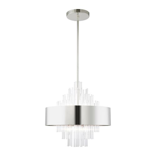 A dramatic addition in this sophisticated contemporary pendant brings a sense of luxury. Crystal rods tower above and hang below the shade which creates a stunning visual aesthetic. Choose from Natural Brass or Polished Nickel finishes.