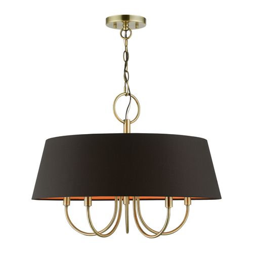 The five-light Palma pendant chandelier has a modern and retro appeal. The hand-crafted black fabric hardback angled shade is set off by an inner silky orange fabric that combines with chandelier-like sweeping arms which creates a versatile effect. Perfect fit for the living room, dining room, kitchen or bedroom. Choose from Antique Brass or Black finishes.
