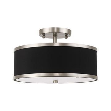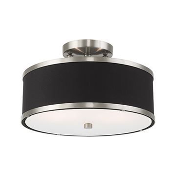 Update your decor with this sleek semi flush mount design. The shaded frame comes in a Brushed Nickel finish which nicely complements the hand crafted black fabric hardback shade.