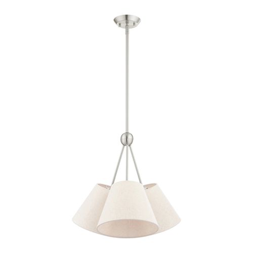 The Prato collection is both modern and versatile. The hand-crafted oatmeal colored fabric hardback shade sets a pleasant mood. The three-light shade cluster adds character to this handsomely styled pendant. Perfect fit for the living room, dining room, kitchen and bedroom. This sleek design is available in Bronze or Brushed Nickel finishes.