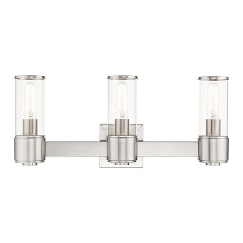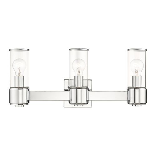 The Livex Lighting Quincy 3 Light Vanity Light is a stunning addition to enhance the ambiance of your bathroom. This vanity sconce features three clear glass lights side by side, with a center wall mount flanked on each side by lights, creating an elegant and balanced design that brightens up any bathroom.