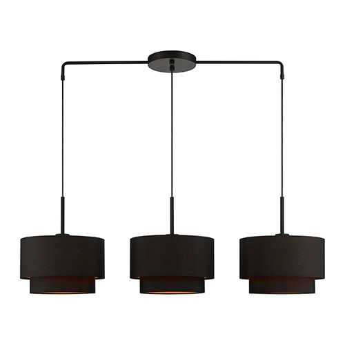 The Sentosa collection has a modern and retro appeal. The hand-crafted black fabric hardback shades are set off by the silky orange fabric on the inside creating an intriguing effect. The three-light double drum shade adds character to this handsomely styled linear chandelier. Perfect fit for the living room, dining room, kitchen and bedroom. This sleek design is shown in a black finish.