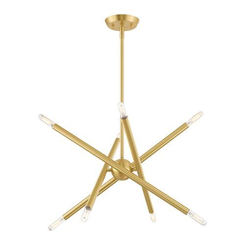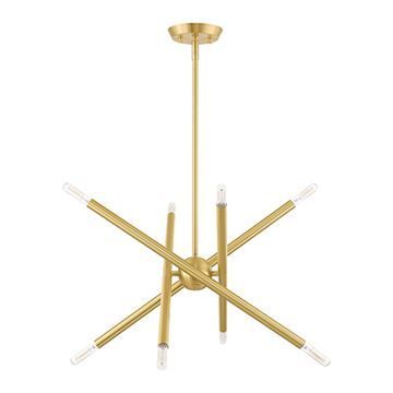 Livex Lighting Soho Chandelier features an asymmetrical criss-crossing rod design. Ideal for kitchens or dining room settings, these space-aged inspired pieces are so versatile they can be incorporated into a variety of interiors. Available in Satin Brass.
