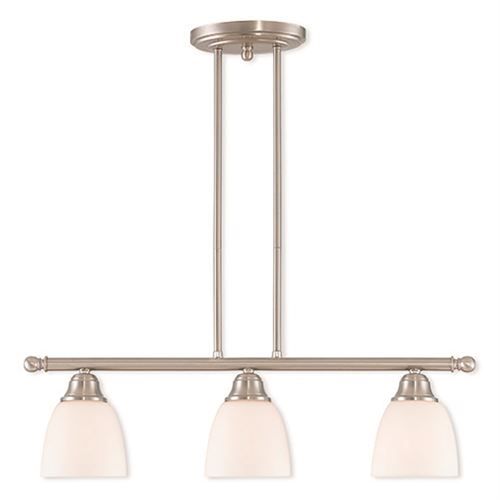 Livex Lighting Somerville Linear Chandelier is not quite contemporary, not fully traditional with its three light, bar design. Intriguing concepts of basic shapes complement a Brushed Nickel finish and hand blown satin opal white glass.