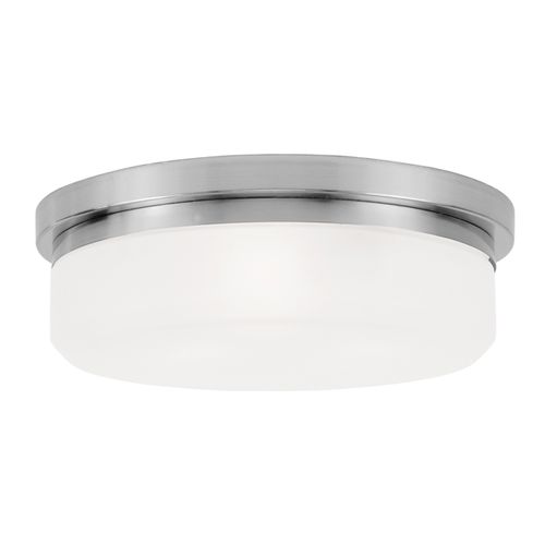This flush mount from the Stratus collection offers bright lighting in a simple, unadorned style. Rounded hand blown satin opal white glass seems to float over a Bronze, Brushed Nickel, or Polished Chrome frame.