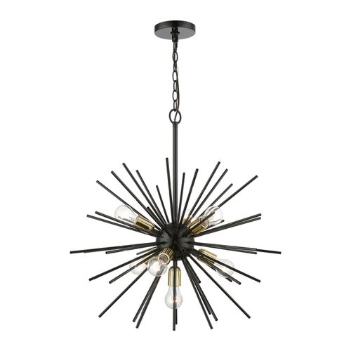 The Tribeca seven light pendant chandelier will become an attention-grabbing feature in your modern home decor. The sleek finish with Polished Brass finish accents grace the design with elegance and charm, providing a traditional quality to the appearance. The iron pipe rods gives the pendant chandelier a sleek and attractive style. Choose from Shiny Black or Soft Gold finishes.