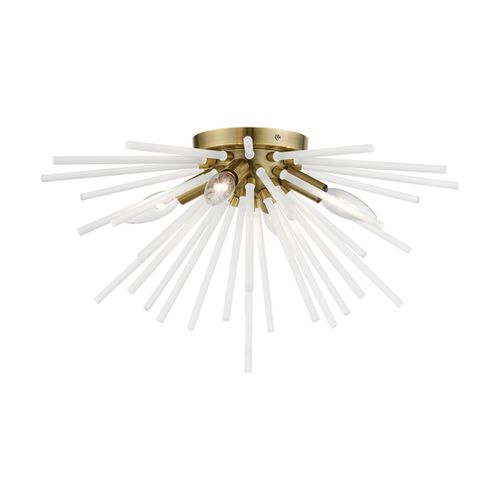 The Uptown four light ceiling mount will become an attention-grabbing feature in your modern home decor. The smooth finish graces the design with elegance and charm, providing a traditional quality to the appearance. The acid etched rods gives the ceiling mount a sleek and attractive style. Choose from Antique Brass, Black, or Brushed Nickel finishes.