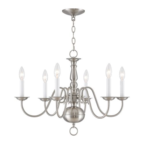 Simple, yet refined, the traditional, colonial chandelier is a perennial favorite. Part of the Williamsburgh series, this handsome chandelier is a timeless beauty. Choose from Brushed Nickel, Polished Nickel, or Scandinavian Gray finishes.