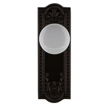 Nostalgic Warehouse Meadows Passage White Porcelain Door Set features a Meadows Plate with botanical flourishes and beaded border paired with a White Porcelain Knob. Made of solid brass and available in seven popular finishes. Passage door sets have no locking mechanism.