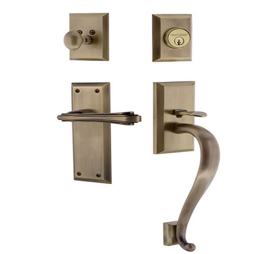 Clean lines and beveled edges of the Nostalgic Warehouse New York S Grip Entry Set Fleur - Keyed Alike give a grand look on any door. A bold S-curve handle on one side and sleek lever on the other complete the classic appeal. Available in five finishes, choice of handling and two backsets. All Nostalgic Warehouse exterior handlesets are mounted on a solid (not plated) forged brass base for durability and beauty.