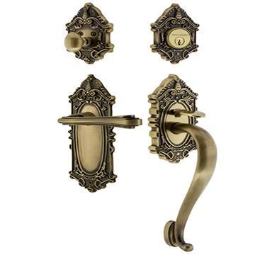 The Nostalgic Warehouse Victorian S Grip Entry Set Fleur - Keyed Alike, with its distinct curvilinear embellishment, adds Victorian elegance to any door. All Nostalgic Warehouse handlesets are mounted on a solid (not plated) forged brass base for durability and beauty.