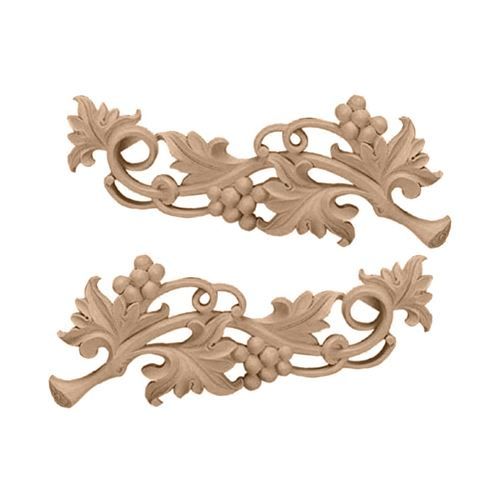 This delightful Restorers Architectural Large Grape Scroll Onlay Applique Pair will bring a vineyard feel to your design. The handcrafted wood pieces are the perfect accent for walls, furniture, cabinets, mantels, and more. Crafted after traditional and historical designs, each piece is carefully carved and then sanded ready to stain or paint. Offered in five distinctive wood types.
