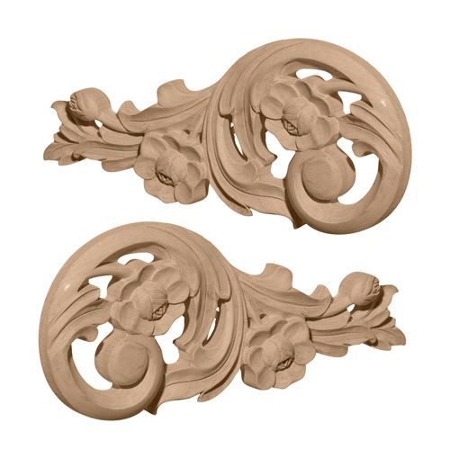 Restorers Architectural Medium Springtime Scroll Applique Pair features two beautifully detailed scrolls with spring flower accents. The 9 3/4 inch scroll designs are handcrafted from premium wood and part of our Architectural Collection of carved wood. Onlay Appliques are a great way to add a pretty decorative touch to cabinetry, furniture, molding, mantels, and more. These lovely appliques are factory sanded and ready to paint or stain. Alder, Cherry, Maple, Lindenwood.