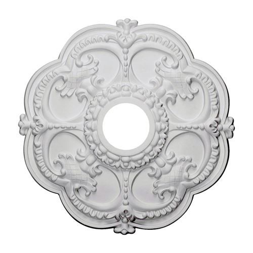 Ceiling medallions are an inexpensive way to add a pretty design element to the ceiling. The Rotherham Urethane Ceiling Medallion is an elegant 18-inch medallion with scalloped edges and a pretty design modeled after historical patterns. It is made from a durable and lightweight polyurethane that will not crack or split like plaster medallions. Installation is easy with simple glues and screws. It comes factory primed and ready to paint or faux finish.