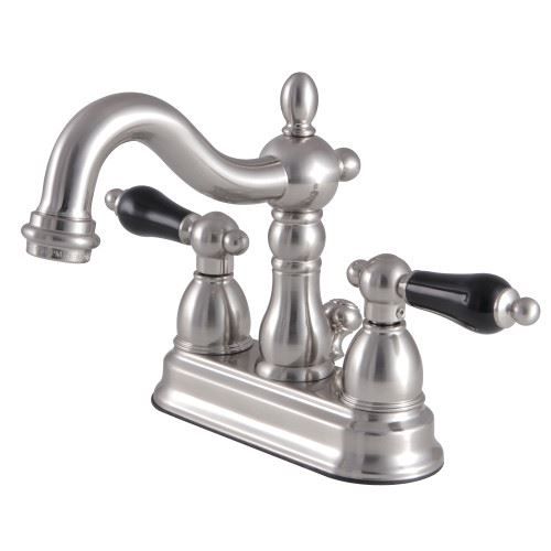 A luxurious goose-neck faucet and black porcelain handles present a noble presence in this Restorers Duchess KB160XPKL-P 4 Inch Centerset Faucet. Centerset bathroom faucets are ideal for smaller bathrooms and feature an easy 3-hole installation. The Duchess 4-inch centerset bathroom faucet is amde of Brass with premium finish. A matching finish drain is also included.