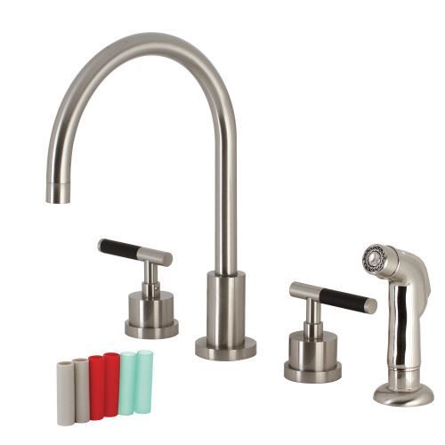 This faucet tastefully interweaves top-notch ergonomic design and the sheen of contemporary simplicity with its black silicone rubber coated handles and cylindrical facets. Able to fit a variety of sink set-ups, widespread kitchen faucets can be utilized in several multi-hole configurations. These are ideal for larger kitchens, as they are more spread apart, and with the included side-sprayer feature a 4-hole installation. The brushed nickel finish will also provide a long lasting and warm touch to your kitchen ensemble. Allow the brass construction to provide a sturdy and reliant fixture.