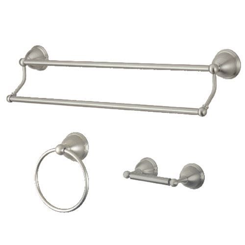 • 3 Piece Set Includes: 24" Dual Towel Bar, Towel Ring, Toilet Paper Holder