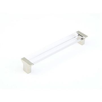 Bring a modern vibe to your cabinets with this Schaub Positano Satin Nickel Clear Cabinet Pull with clear polycarbonate handle with metal end posts. Part of the Positano collection. 6 5/8 x 1 inch. Satin Nickel finish.